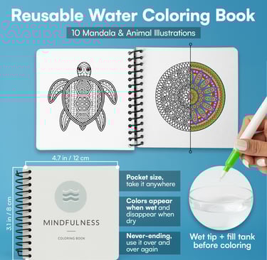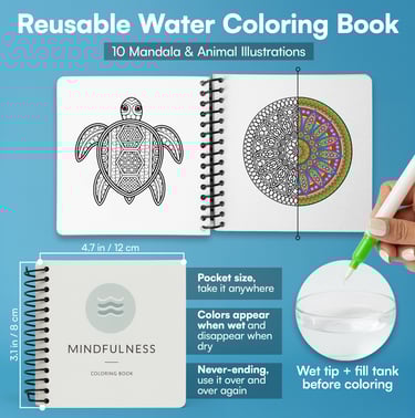 Relax through creativity with this reusable water coloring book. Simply fill the pen with water and reveal vibrant colors as you draw—no mess, no ink, just calming, mindful fun.